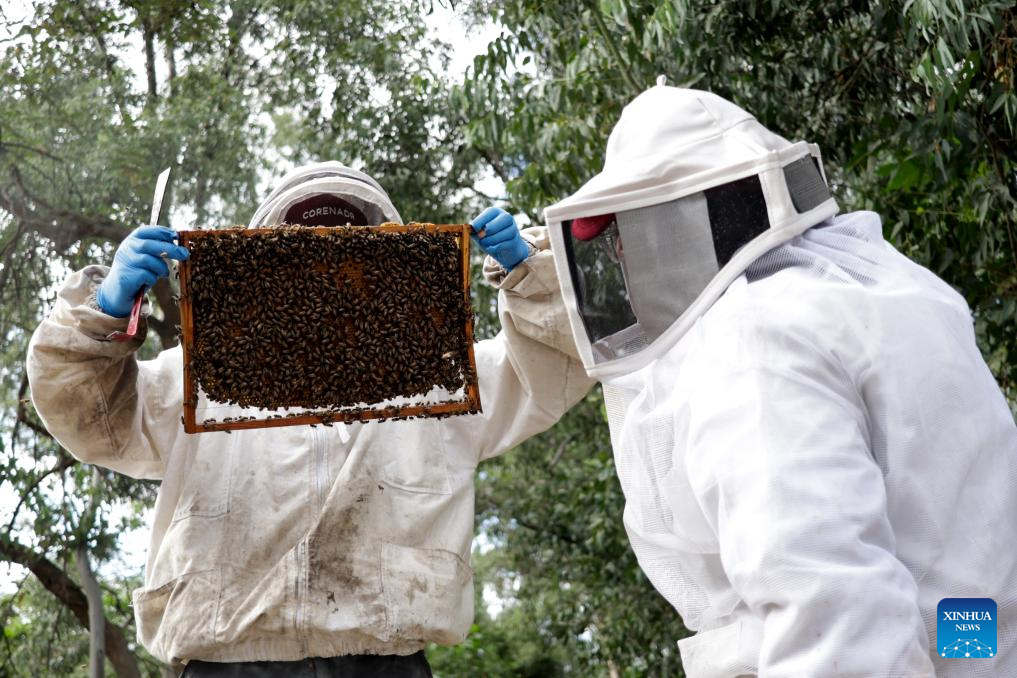 CIUDAD DE MEXICO, 11 julio, 2024 (Xinhua) -- Imagen del 2 de julio de 2024 de elementos de la Comisión de Recursos Naturales y Desarrollo Rural revisando abejas después del rescate de un enjambre como parte del proyecto "Reubicación de Enjambres y Colonias Silvestres Capturados en la Ciudad de México", en la Ciudad de México, capital de México. Las abejas son esenciales para la vida en el planeta, pero en las grandes urbes los habitantes tienen miedo a su picadura y las eliminan, por lo que autoridades ambientales de la Ciudad de México llevan a cabo un programa para rescatar enjambres y entregarlos a grupos de apicultores. (Xinhua/Francisco Cañedo)