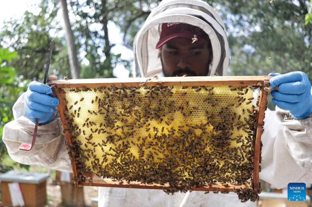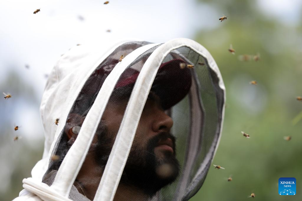 CIUDAD DE MEXICO, 11 julio, 2024 (Xinhua) -- Imagen del 2 de julio de 2024 de un elemento de la Comisión de Recursos Naturales y Desarrollo Rural revisando abejas después del rescate de un enjambre como parte del proyecto "Reubicación de Enjambres y Colonias Silvestres Capturados en la Ciudad de México", en la Ciudad de México, capital de México. Las abejas son esenciales para la vida en el planeta, pero en las grandes urbes los habitantes tienen miedo a su picadura y las eliminan, por lo que autoridades ambientales de la Ciudad de México llevan a cabo un programa para rescatar enjambres y entregarlos a grupos de apicultores. (Xinhua/Francisco Cañedo)