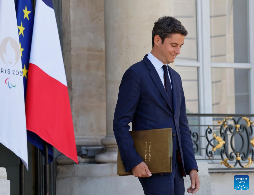 Imagen del 16 de julio de 2024 del primer ministro francés, Gabriel Attal, saliendo después de una reunión semanal de gabinete en el presidencial Palacio del Elíseo, en París, Francia. El presidente de Francia, Emmanuel Macron, aceptó la dimisión del primer ministro Gabriel Attal, pero le pidió permanecer al frente de un Gobierno provisional hasta el establecimiento de una nueva administración, anunció el martes la oficina presidencial francesa. (Xinhua/Henri Szwarc)