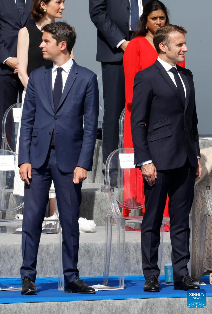 Imagen del 14 de julio de 2024 del presidente francés, Emmanuel Macron (d-frente), y el primer ministro francés, Gabriel Attal (i-frente), asistiendo al desfile militar anual por el Día de La Bastilla, en París, Francia. El presidente de Francia, Emmanuel Macron, aceptó la dimisión del primer ministro Gabriel Attal, pero le pidió permanecer al frente de un Gobierno provisional hasta el establecimiento de una nueva administración, anunció el martes la oficina presidencial francesa. (Xinhua/Henri Szwarc)