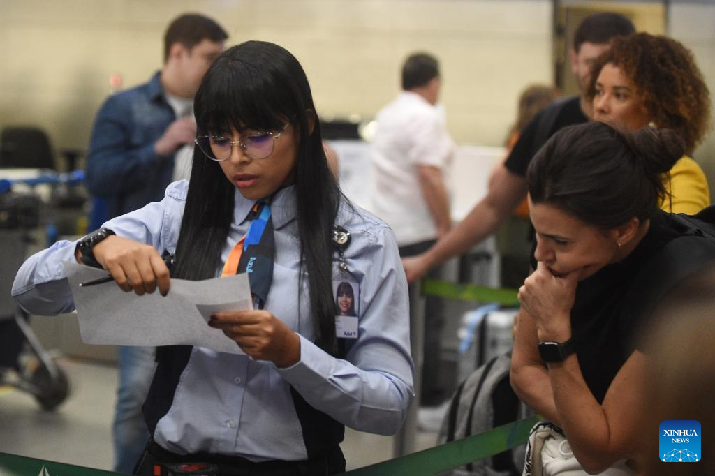 BRASILIA, 19 julio, 2024 (Xinhua) -- Una trabajadora de la aerolínea Azul revisa la lista de pasajeros que esperan abordar hacia Sao Paulo durante las afectaciones provocadas por una falla informática global, en el aeropuerto Juscelino Kubitschek, en Brasilia, Brasil, el 19 de julio de 2024. Brasil se vio afectado parcialmente por la falla informática global ocurrida el viernes, con problemas en el funcionamiento de algunos aeropuertos y bancos, así como en el portal web de noticias del Supremo Tribunal Federal, la máxima corte del país. (Xinhua/Lucio Tavora)
