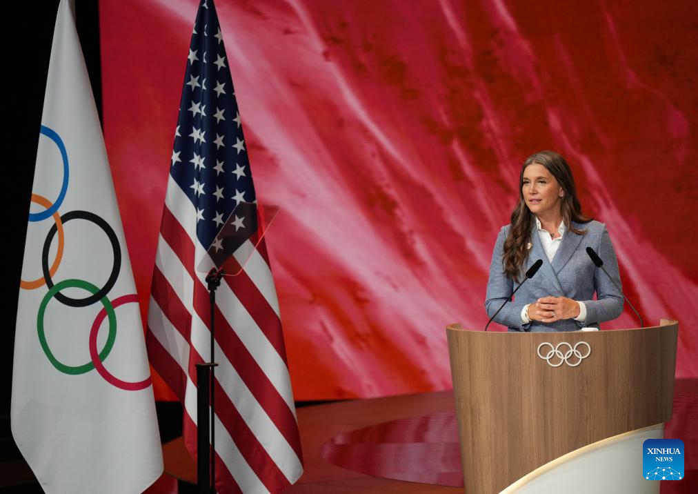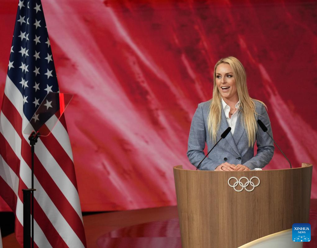 La esquiadora alpina estadounidense Lindsey Vonn habla en una reunión durante la 142ª sesión del Comité Olímpico Internacional (COI), en París, Francia, el 24 de julio de 2024. Salt Lake City de Estados Unidos ha sido designada sede de los Juegos Olímpicos de Invierno de 2034 en la 142ª sesión del COI aquí el miércoles. (Xinhua/Sun Fei)