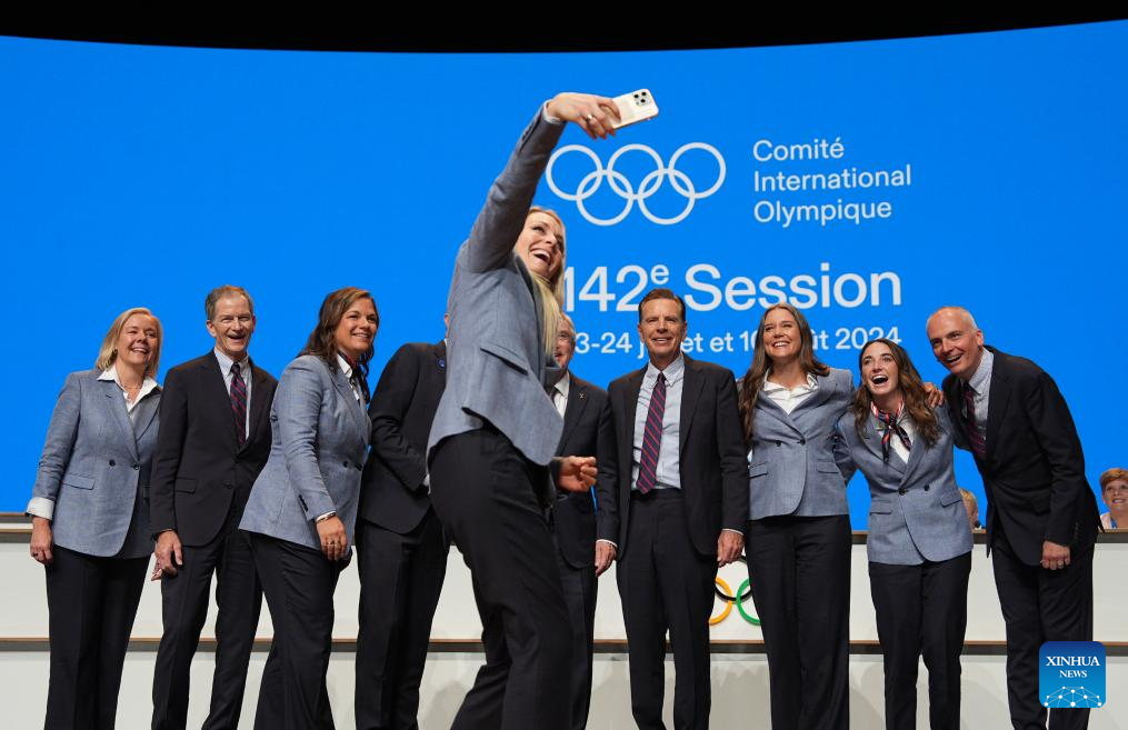 La esquiadora alpina estadounidense Lindsey Vonn se toma una fotografía en una reunión durante la 142ª sesión del Comité Olímpico Internacional (COI), en París, Francia, el 24 de julio de 2024. Salt Lake City de Estados Unidos ha sido designada sede de los Juegos Olímpicos de Invierno de 2034 en la 142ª sesión del COI aquí el miércoles. (Xinhua/Sun Fei)