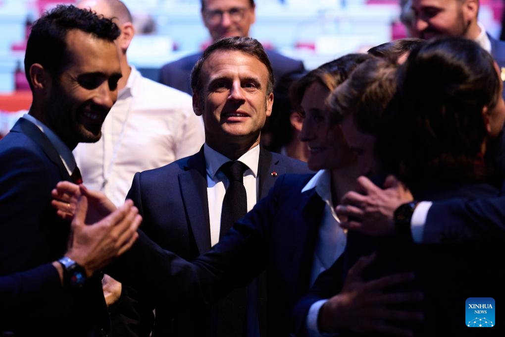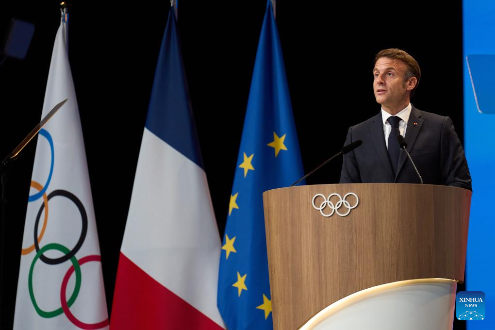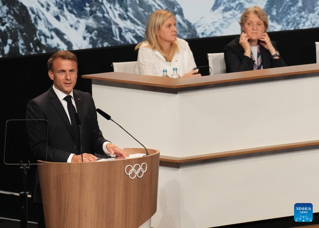 El presidente francés, Emmanuel Macron, habla en una reunión durante la 142ª sesión del Comité Olímpico Internacional (COI), en París, Francia, el 24 de julio de 2024. Los Alpes franceses han sido adjudicados como sede de los Juegos Olímpicos de Invierno de 2030 por el COI el miércoles, pero bajo la condición de que el Gobierno francés ofrezca garantías financieras y organizativas antes de las fechas fijadas por el COI. (Xinhua/Meng Dingbo)