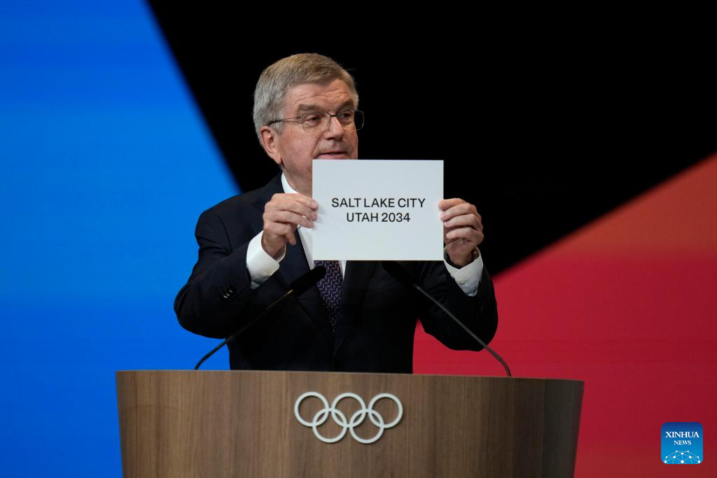 El presidente del Comité Olímpico Internacional (COI), Thomas Bach, muestra un cartel que Salt Lake City de Estados Unidos ha sido designada sede de los Juegos de Invierno 2034 durante la 142ª sesión del COI en los Juegos Olímpicos de Verano 2024, en París, Francia, el 24 de julio de 2024. (Xinhua/Natacha Pisarenko/POOL)