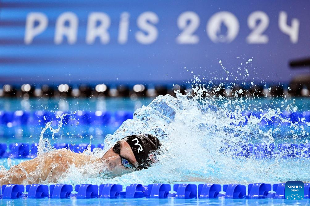PARIS, 4 agosto, 2024 (Xinhua) -- Bobby Finke de Estados Unidos compite durante la final de 1.500 metros estilo libre masculino de natación en los Juegos Olímpicos de París 2024, en París, Francia, el 4 de agosto de 2024. (Xinhua/Wang Peng)