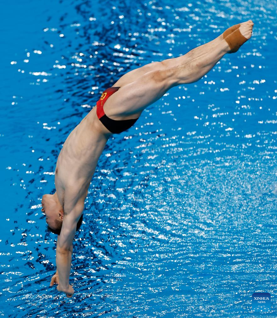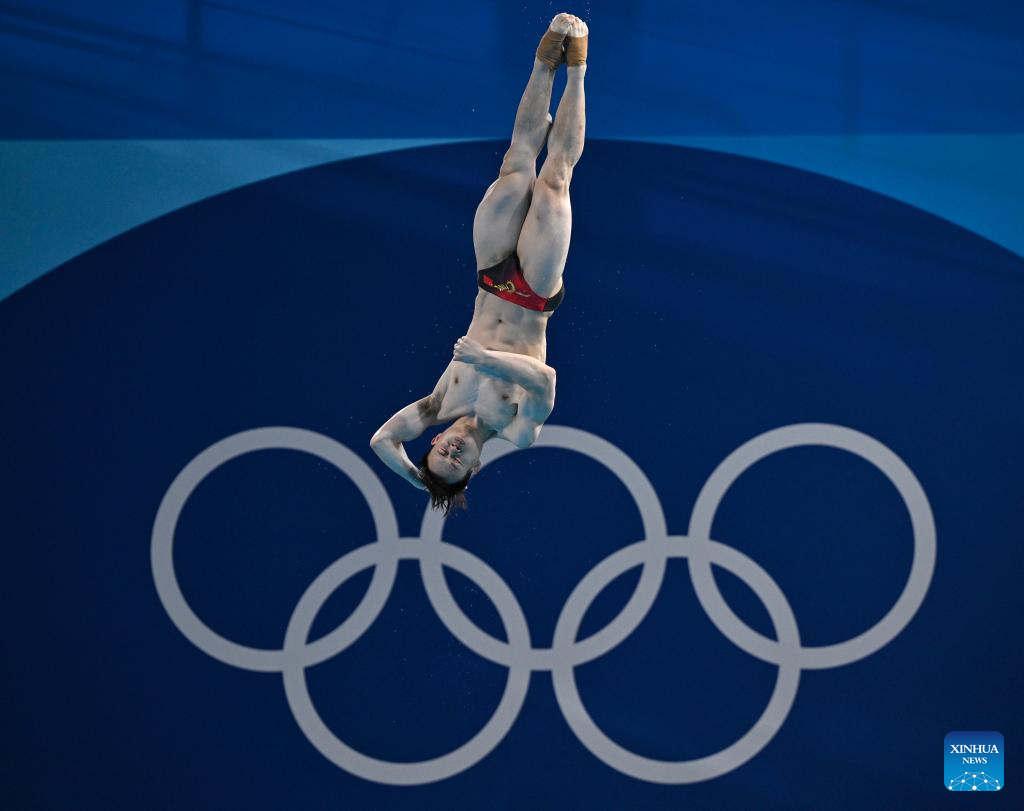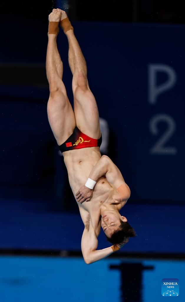 SAINT DENIS, 8 agosto, 2024 (Xinhua) -- Xie Siyi de China compite durante la final de trampolín 3m masculino de saltos en los Juegos Olímpicos de París 2024, en Saint Denis, Francia, el 8 de agosto de 2024. (Xinhua/Wang Peng)