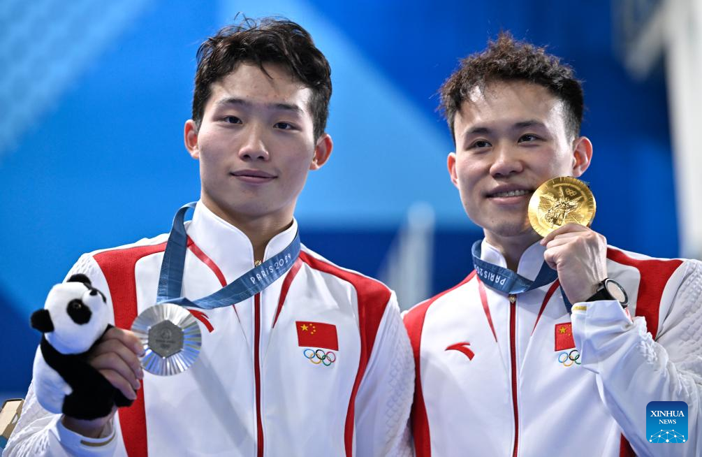 SAINT DENIS, 8 agosto, 2024 (Xinhua) -- El medallista oro Xie Siyi (d) y el medallista de plata Wang Zongyuan de China posan para fotografías durante la ceremonia de premiación al término de la final de trampolín 3m masculino de saltos en los Juegos Olímpicos de París 2024, en Saint Denis, Francia, el 8 de agosto de 2024. (Xinhua/Wang Peng)