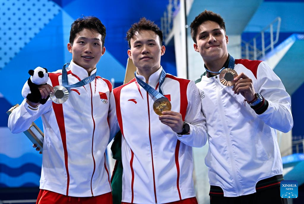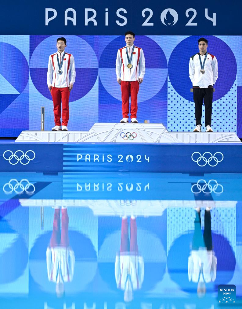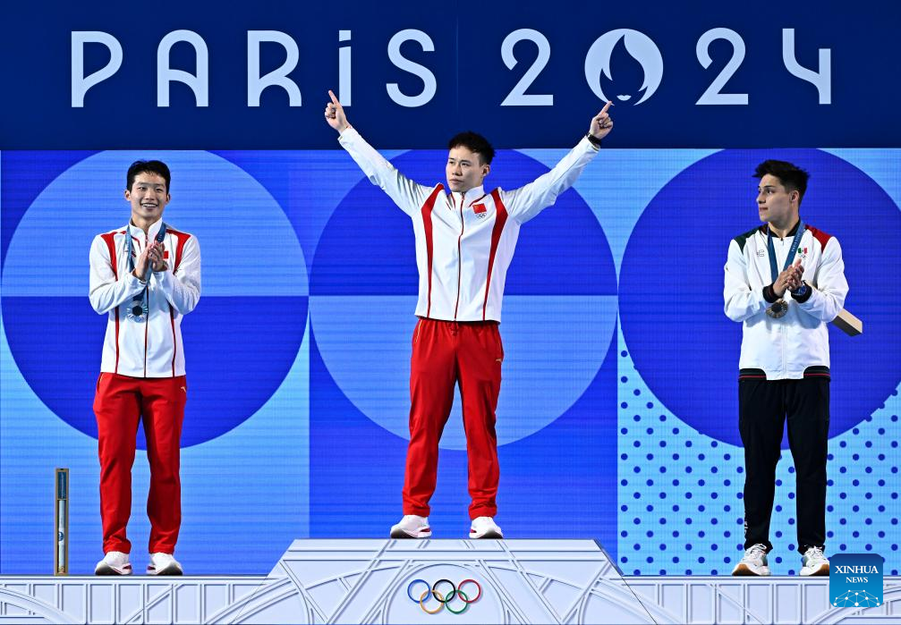 SAINT DENIS, 8 agosto, 2024 (Xinhua) -- El medallista de oro Xie Siyi (c) de China, el medallista de plata Wang Zongyuan (i) de China y el medallista de bronce Osmar Olvera Ibarra de México asisten a la ceremonia de premiación al término de la final de trampolín 3m masculino de saltos en los Juegos Olímpicos de París 2024, en Saint Denis, Francia, el 8 de agosto de 2024. (Xinhua/Wang Peng)