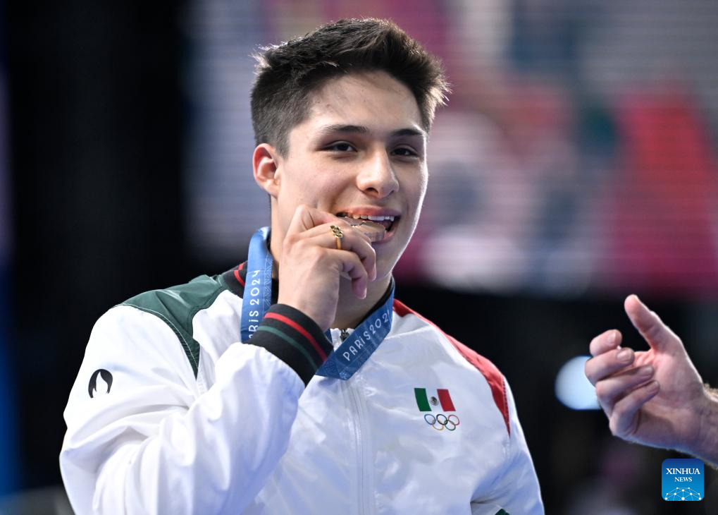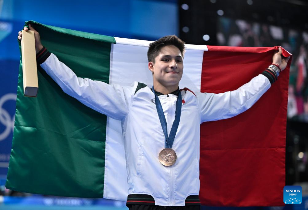 SAINT DENIS, 8 agosto, 2024 (Xinhua) -- El medallista de bronce Osmar Olvera Ibarra de México asiste a la ceremonia de premiación al término de la final de trampolín 3m masculino de saltos en los Juegos Olímpicos de París 2024, en Saint Denis, Francia, el 8 de agosto de 2024. (Xinhua/Wang Peng)