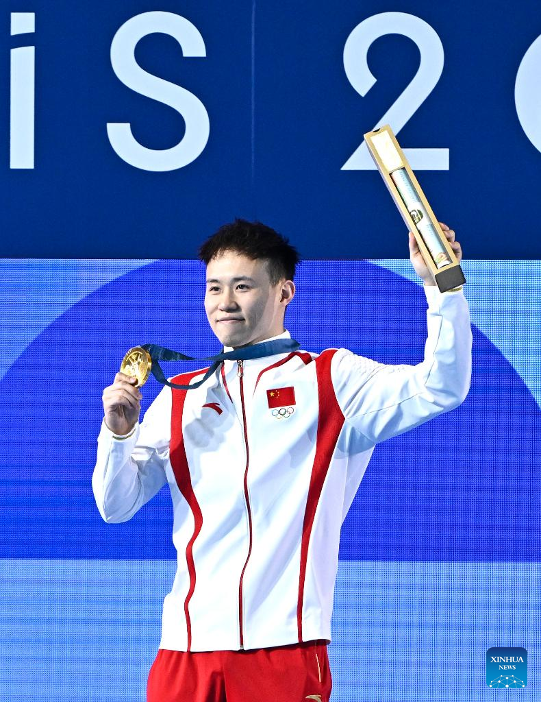 SAINT DENIS, 8 agosto, 2024 (Xinhua) -- El medallista de oro Xie Siyi de China asiste a la ceremonia de premiación al término de la final de trampolín 3m masculino de saltos en los Juegos Olímpicos de París 2024, en Saint Denis, Francia, el 8 de agosto de 2024. (Xinhua/Wang Peng)