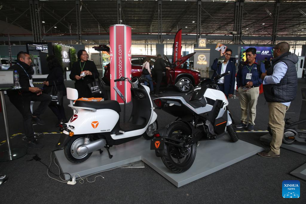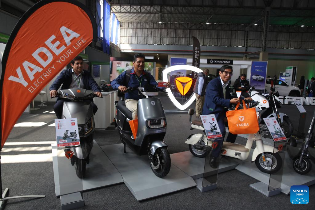 LIMA, 17 agosto, 2024 (Xinhua) -- Imagen del 15 de agosto de 2024 de personas probando motocicletas eléctricas de la marca china Yadea durante el evento "Transporte Sostenible 2024" en el Centro de Exposiciones Jockey, en el sur de Lima, Perú. Lograr un mayor uso de la electromovilidad y gas natural en el sector transporte de Perú puede tener un impacto muy positivo en el bolsillo de los ciudadanos, indicó el sábado el presidente del Comité Consultivo de Transporte Sostenible, Erick García. (Xinhua/Mariana Bazo)