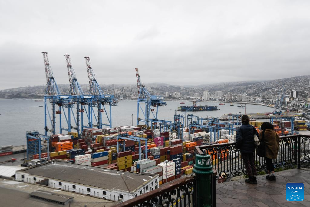 Imagen del 31 de julio de 2024 de personas observando contenedores apilados en el Puerto de Valparaíso, en la ciudad de Valparaíso, Chile. El ministro de Agricultura de Chile, Esteban Valenzuela, aseguró el lunes en su visita oficial a China que espera aumentar las exportaciones chilenas de alimentos, como carnes y frutas, al mercado chino. (Xinhua/Jorge Villegas)