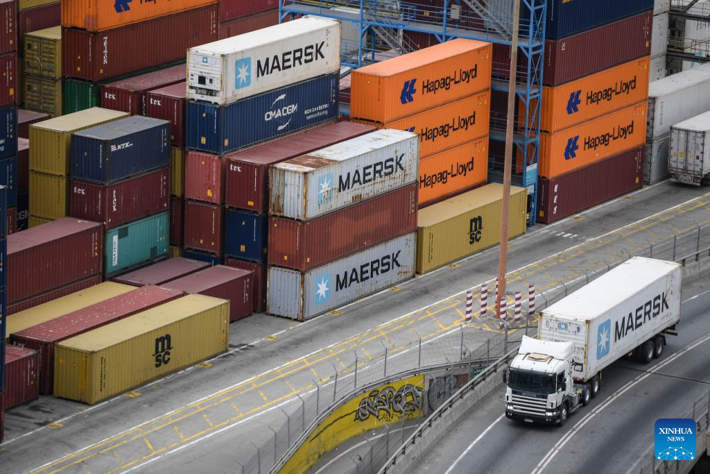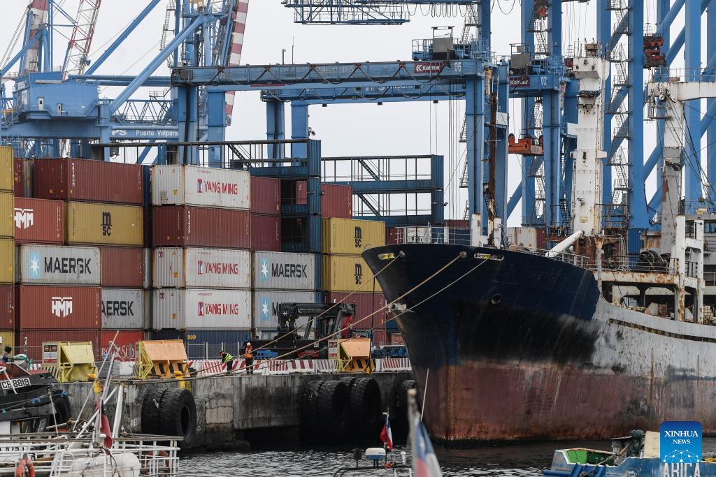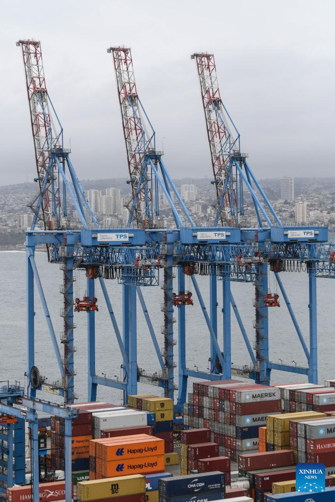 Imagen del 31 de julio de 2024 de trabajadores portuarios laborando frente a contenedores apilados en el Puerto de Valparaíso, en la ciudad de Valparaíso, Chile. El ministro de Agricultura de Chile, Esteban Valenzuela, aseguró el lunes en su visita oficial a China que espera aumentar las exportaciones chilenas de alimentos, como carnes y frutas, al mercado chino. (Xinhua/Jorge Villegas)