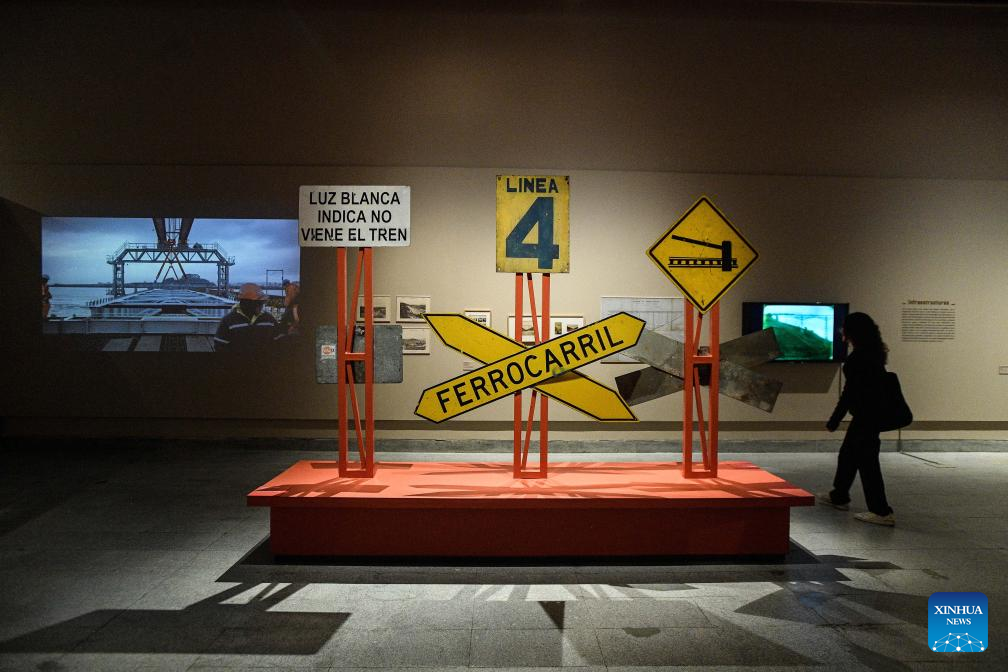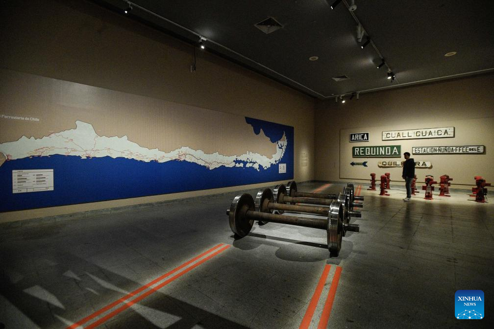 SANTIAGO, 30 ago (Xinhua) -- "Hierro negro que duerme, fierro negro que gime, por cada poro un grito de desconsolación" es parte del poema "Maestranzas de noche" del nobel Pablo Neruda y musicalizado por la banda Congreso, una de las cientos de piezas exhibidas en "Por la línea corre el tren", muestra que cuenta la historia de los 140 años de la Empresa de Ferrocarriles del Estado de Chile a través del arte, objetos, testimonios y material de archivo.