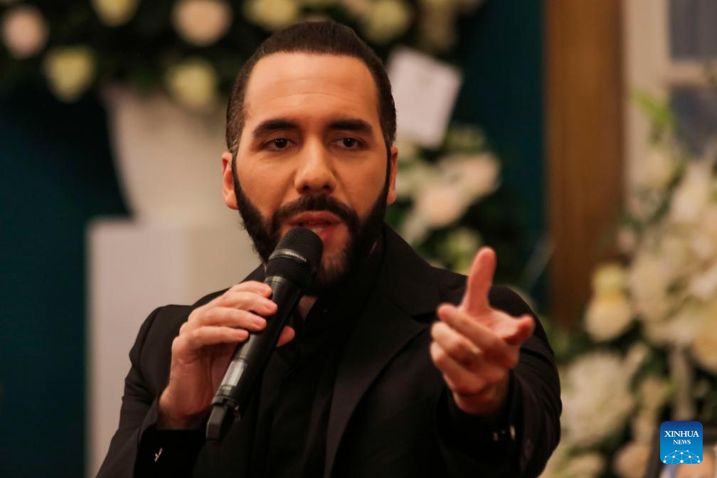 Imagen del 10 de septiembre de 2024 del presidente salvadoreño, Nayib Bukele, hablando durante el funeral de varios mandos oficiales de la Policía y del Ejército salvadoreño, en el departamento de San Salvador, El Salvador. El Salvador continúa rindiendo tributo el miércoles en una masiva despedida a los policías y militares fallecidos la noche del domingo en un trágico accidente aéreo, en el que el helicóptero que los transportaba cayó en un sector del departamento de La Unión. (Xinhua/Alexander Peña)