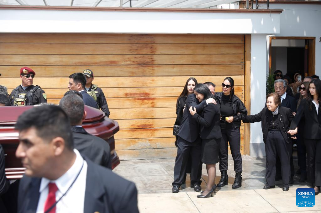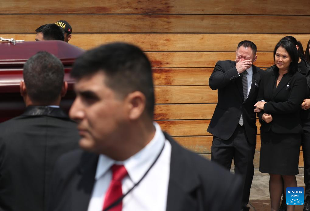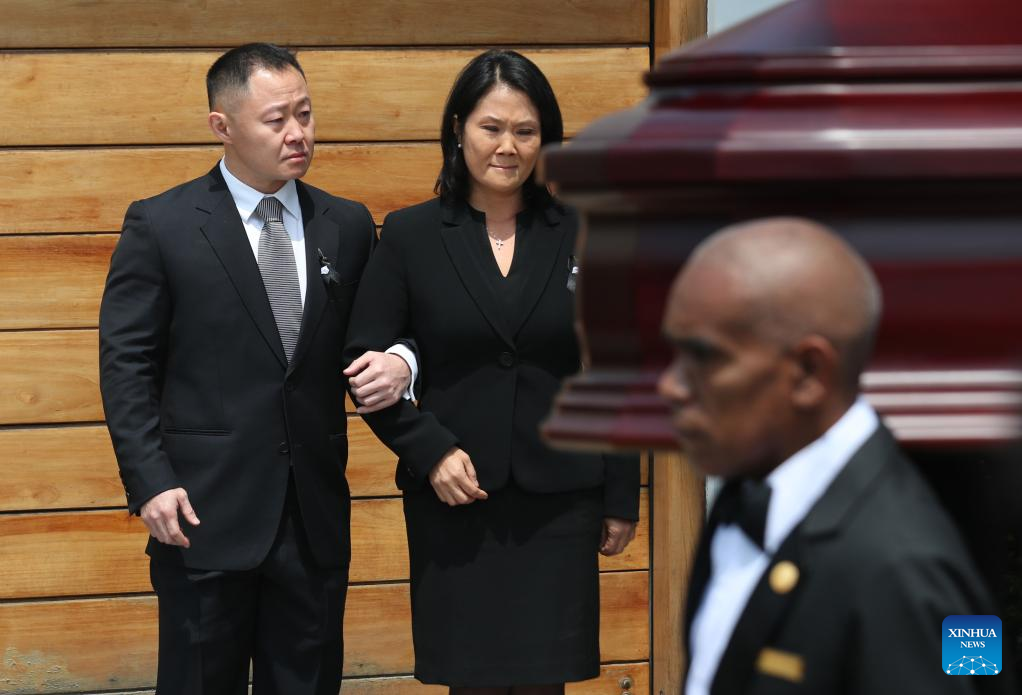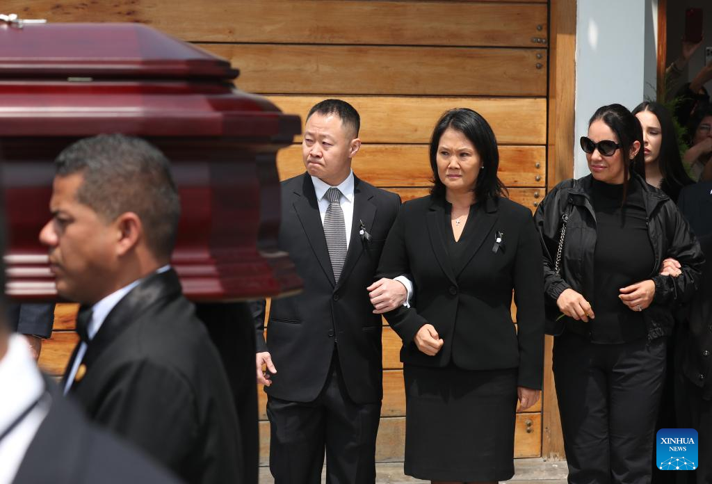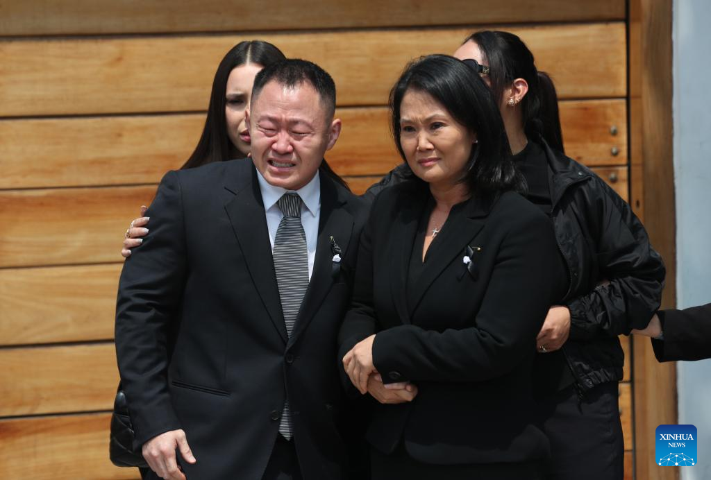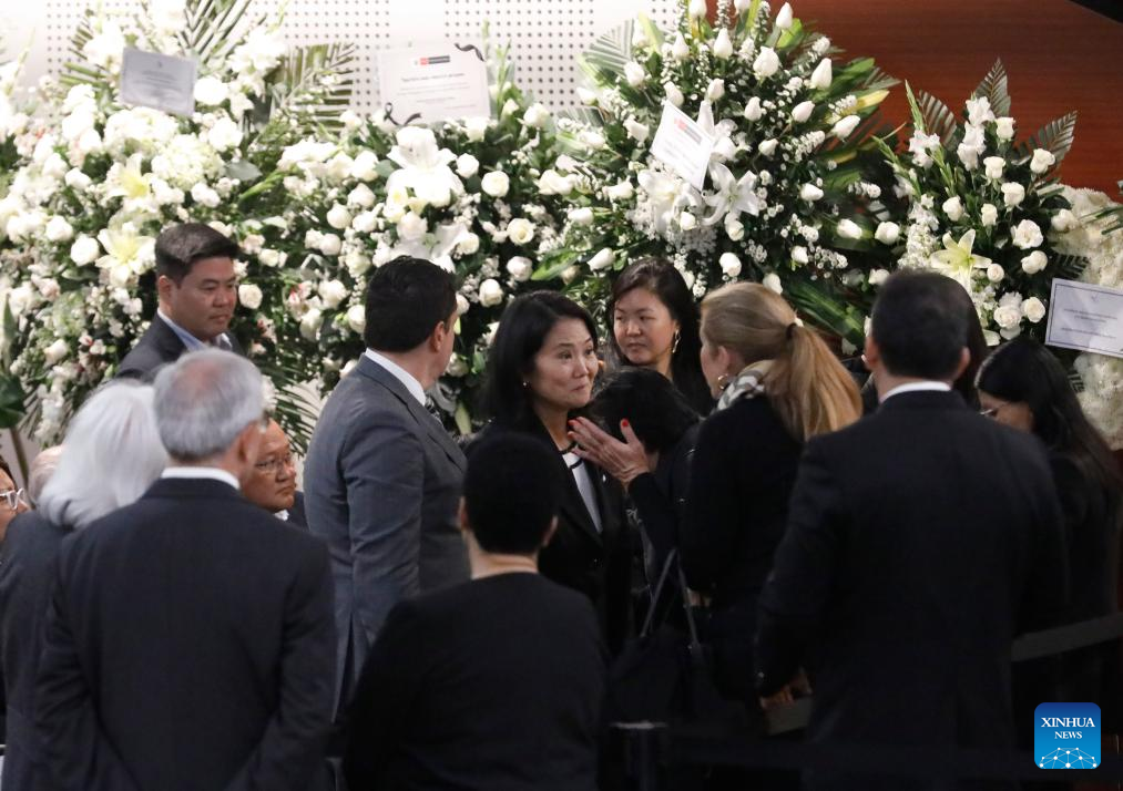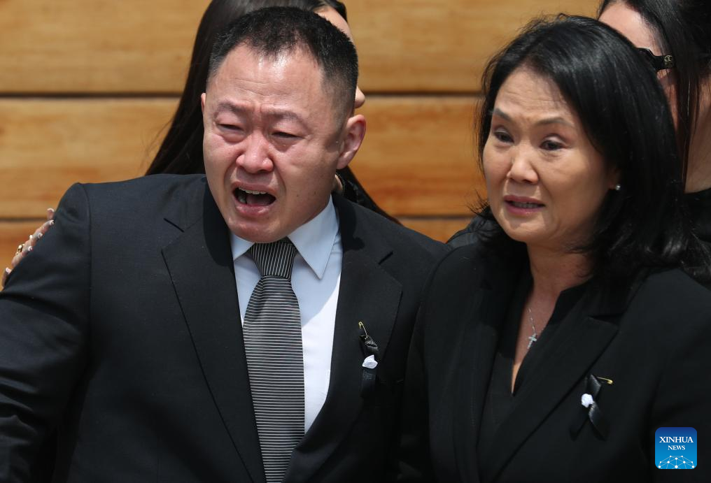 LIMA, 13 septiembre, 2024 (Xinhua) -- Keiko Fujimori (c), hija del expresidente peruano, Alberto Fujimori, asiste al funeral de su padre, en el Museo de La Nación, en Lima, Perú, el 13 de septiembre de 2024. El Gobierno de Perú declaró tres días de duelo nacional por el fallecimiento del exmandatario Alberto Fujimori (1990-2000), quien perdió la vida el miércoles tras una dura batalla contra el cáncer, difundió el jueves el diario oficial "El Peruano". (Xinhua/Mariana Bazo)