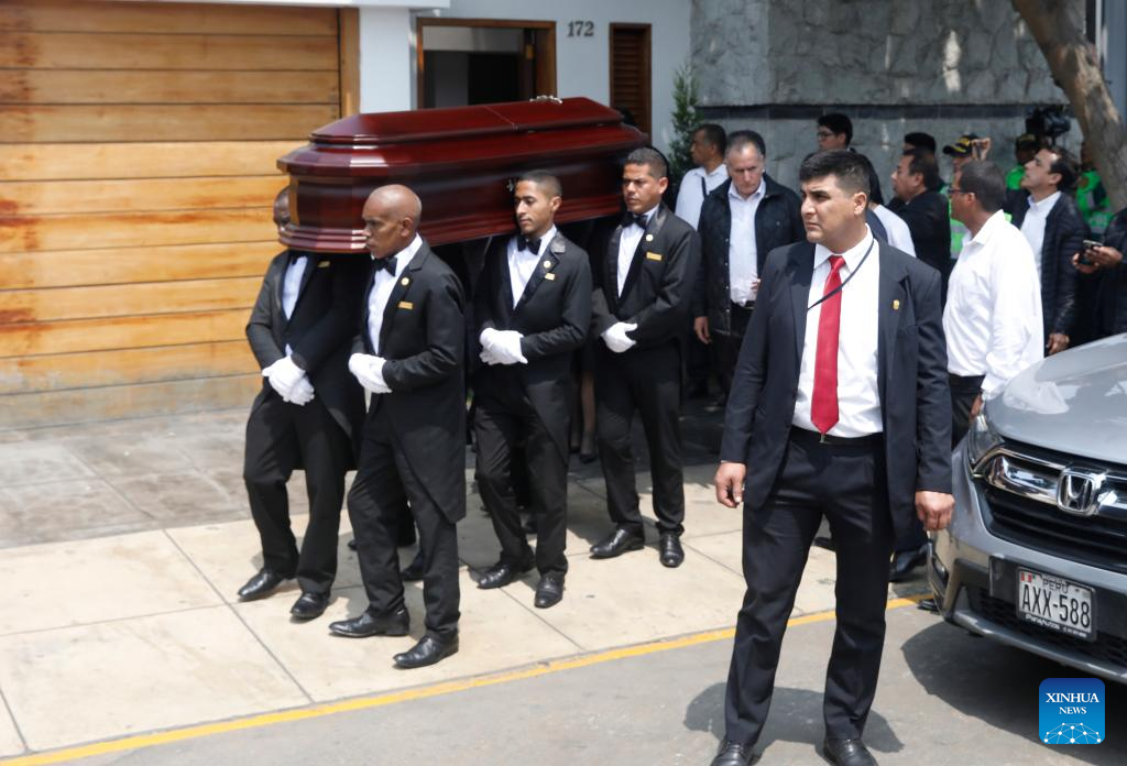 LIMA, 12 septiembre, 2024 (Xinhua) -- Familiares del expresidente peruano, Alberto Fujimori, acompañan el féretro con sus restos, frente a su vivienda, en Lima, Perú, el 12 de septiembre de 2024. El Gobierno de Perú declaró tres días de duelo nacional por el fallecimiento del exmandatario Alberto Fujimori (1990-2000), quien perdió la vida el miércoles tras una dura batalla contra el cáncer, difundió el jueves el diario oficial "El Peruano". (Xinhua/Mariana Bazo)