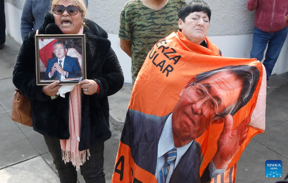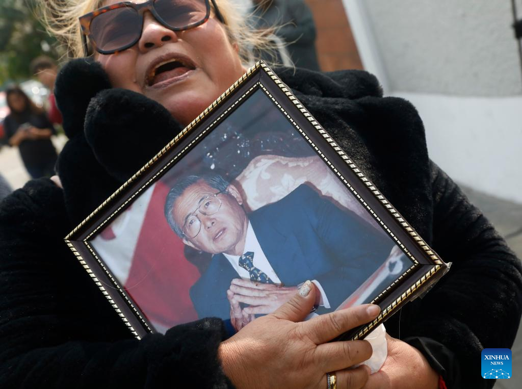 LIMA, 12 septiembre, 2024 (Xinhua) -- Simpatizantes del expresidente peruano, Alberto Fujimori, reaccionan frente a la vivienda del expresidente, en Lima, Perú, el 12 de septiembre de 2024. El Gobierno de Perú declaró tres días de duelo nacional por el fallecimiento del exmandatario Alberto Fujimori (1990-2000), quien perdió la vida el miércoles tras una dura batalla contra el cáncer, difundió el jueves el diario oficial "El Peruano". (Xinhua/Mariana Bazo)