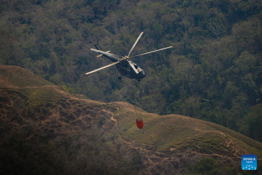 SAN MARTIN, 20 septiembre, 2024 (Xinhua) -- Vista aérea cedida por la Presidencia de Perú del 19 de septiembre de 2024 de un helicóptero transportando agua para combatir incendios forestales, en la región San Martín, Perú. La presidenta de Perú, Dina Boluarte, declaró el miércoles en emergencia las regiones de Amazonas, San Martín y Ucayali, duramente afectadas por los incendios forestales que afectan al país. (Xinhua/Presidencia de Perú)
