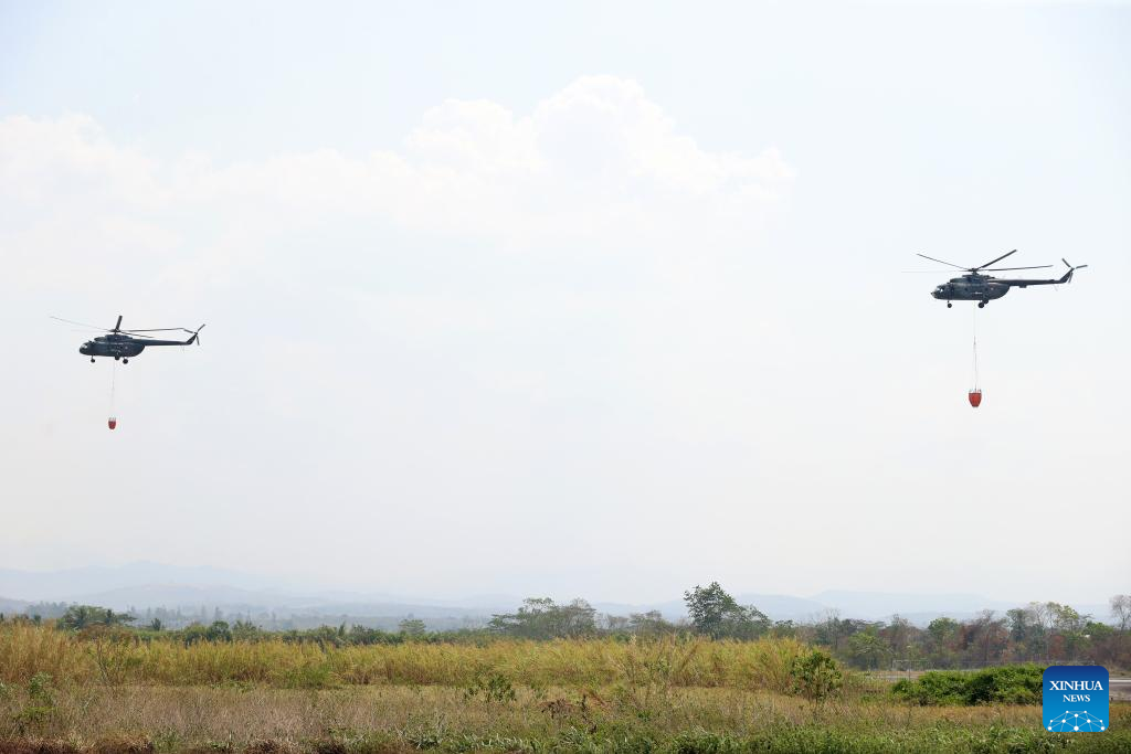 SAN MARTIN, 20 septiembre, 2024 (Xinhua) -- Imagen cedida por la Presidencia de Perú del 19 de septiembre de 2024 de personal militar preparando helicópteros para combatir incendios forestales, en la región San Martín, Perú. La presidenta de Perú, Dina Boluarte, declaró el miércoles en emergencia las regiones de Amazonas, San Martín y Ucayali, duramente afectadas por los incendios forestales que afectan al país. (Xinhua/Presidencia de Perú)