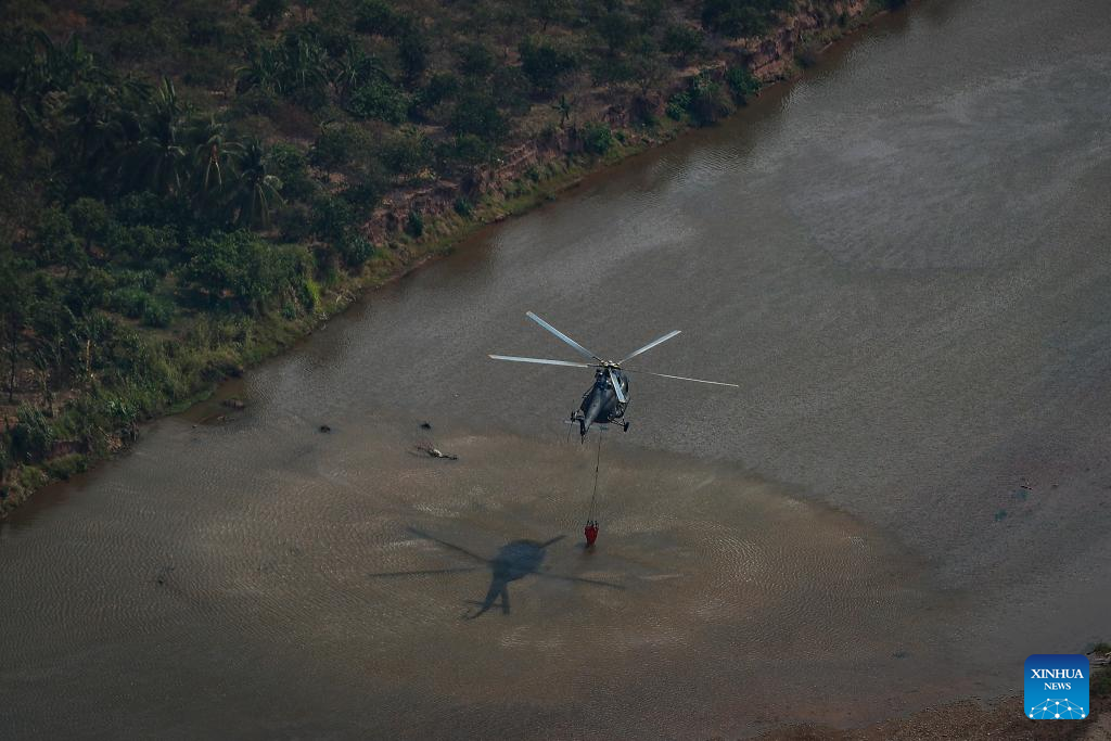 SAN MARTIN, 20 septiembre, 2024 (Xinhua) -- Vista aérea cedida por la Presidencia de Perú del 19 de septiembre de 2024 de un helicóptero recolectando agua de un río para combatir incendios forestales, en la región San Martín, Perú. La presidenta de Perú, Dina Boluarte, declaró el miércoles en emergencia las regiones de Amazonas, San Martín y Ucayali, duramente afectadas por los incendios forestales que afectan al país. (Xinhua/Presidencia de Perú)