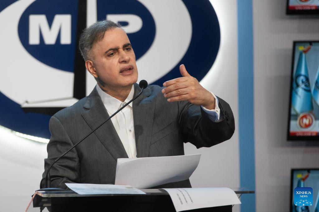 El fiscal general de Venezuela, Tarek William Saab (atrás), habla durante una conferencia de prensa, en Caracas, Venezuela, el 24 de septiembre de 2024. Las autoridades venezolanas han solicitado a la policía internacional Interpol la captura del presidente argentino, Javier Milei, por estar presuntamente involucrado en el "robo" de un avión de la empresa estatal venezolana Emtrasur, informó el martes Saab. (Xinhua/Marcos Salgado)
