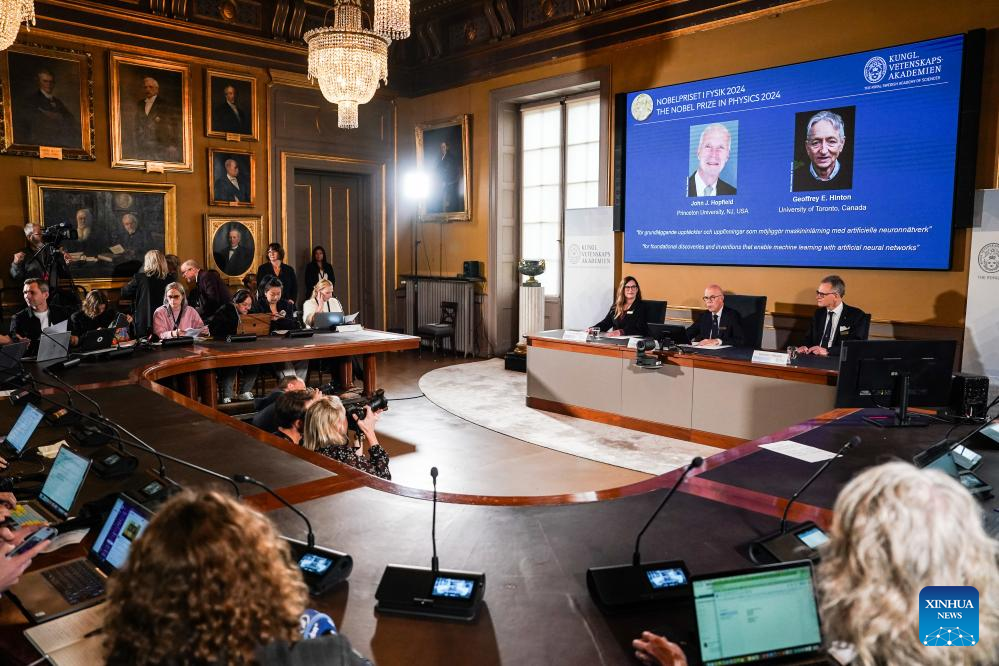El Premio Nobel de Física 2024 es anunciado en Estocolmo, Suecia, el 8 de octubre de 2024. El Premio Nobel de Física 2024 recayó en dos científicos, John J. Hopfield y Geoffrey E. Hinton, por descubrimientos e invenciones fundamentales que permiten el aprendizaje automático con redes neuronales artificiales, informó el martes la Real Academia Sueca de las Ciencias. (Xinhua/Peng Ziyang)