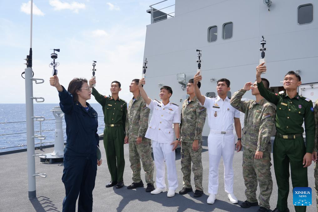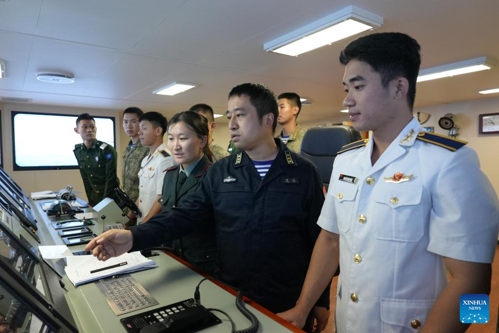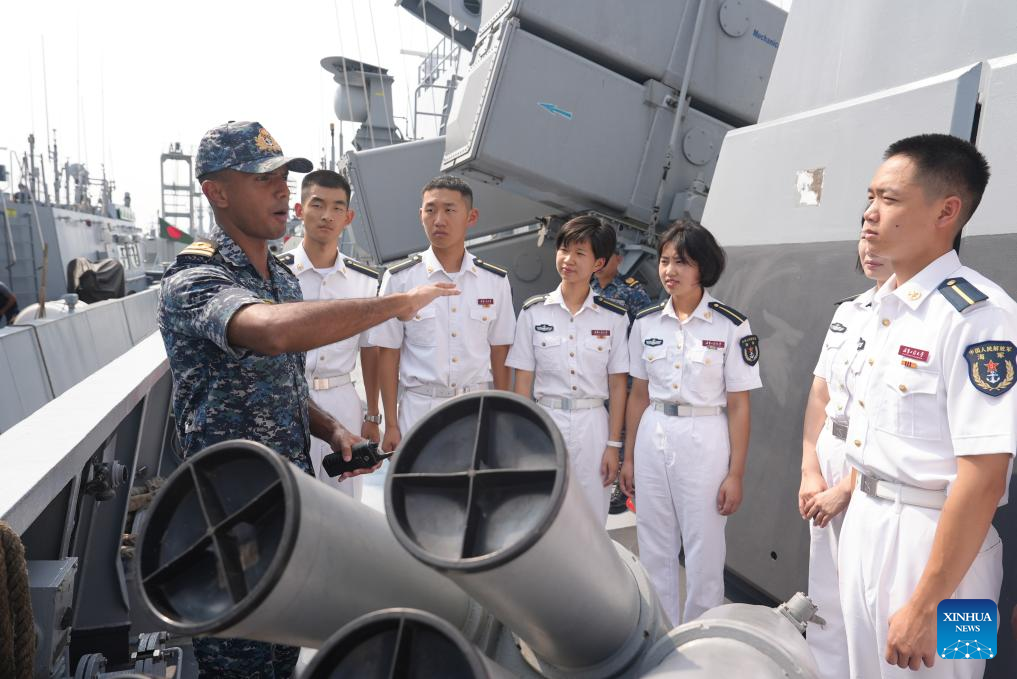 Imagen del 13 de octubre de 2024 de cadetes de la Universidad Naval de Ingeniería realizando una misión de visita a ultramar en un buque de la armada de Bangladesh. Una flota de la Armada china, integrada por los buques Qijiguang y Jinggangshan, regresó el viernes a su puerto militar en la ciudad de Zhanjiang, provincia de Guangdong, en el sur de China, tras concluir su misión de 35 días de entrenamiento oceánico y visitas a ultramar. (Xinhua/Ming Yongsheng)