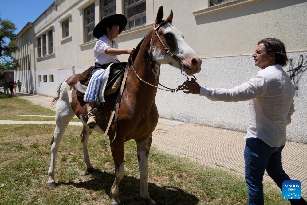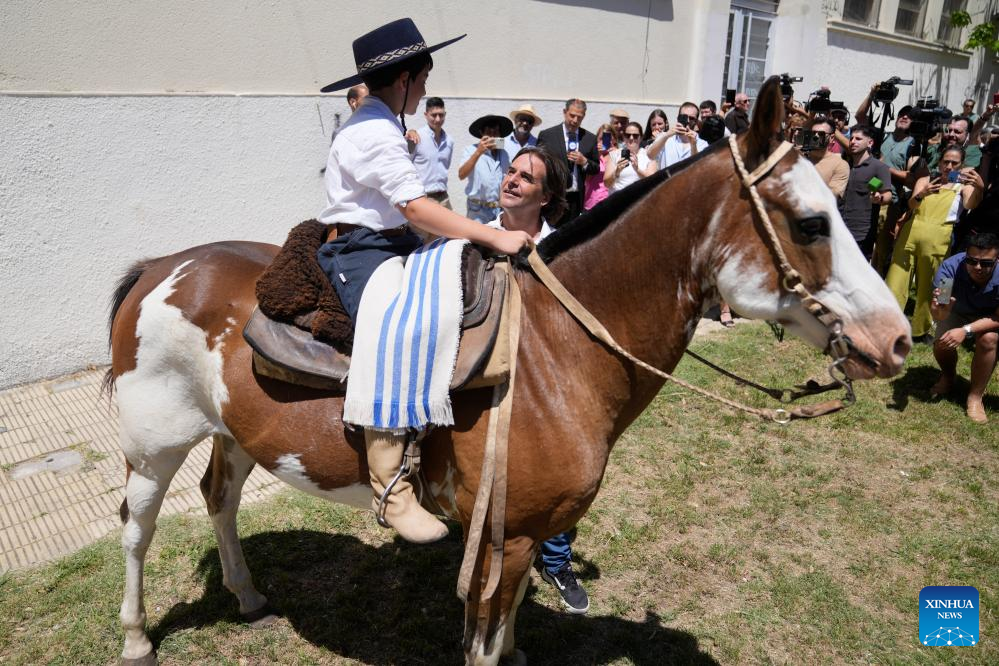 El presidente uruguayo, Luis Lacalle Pou (atrás), saluda a un niño montado en su caballo previo a emitir su voto durante la segunda vuelta de la elección presidencial en un colegio electoral, en Canelones, Uruguay, el 24 de noviembre de 2024. Lacalle Pou votó el domingo en la segunda vuelta de las elecciones presidenciales y dijo que esta misma noche llamará a quien resulte el candidato ganador entre el oficialista Alvaro Delgado y el opositor Yamandú Orsi para que se abra el proceso de transición de mandato. (Xinhua/Nicolás Celaya)