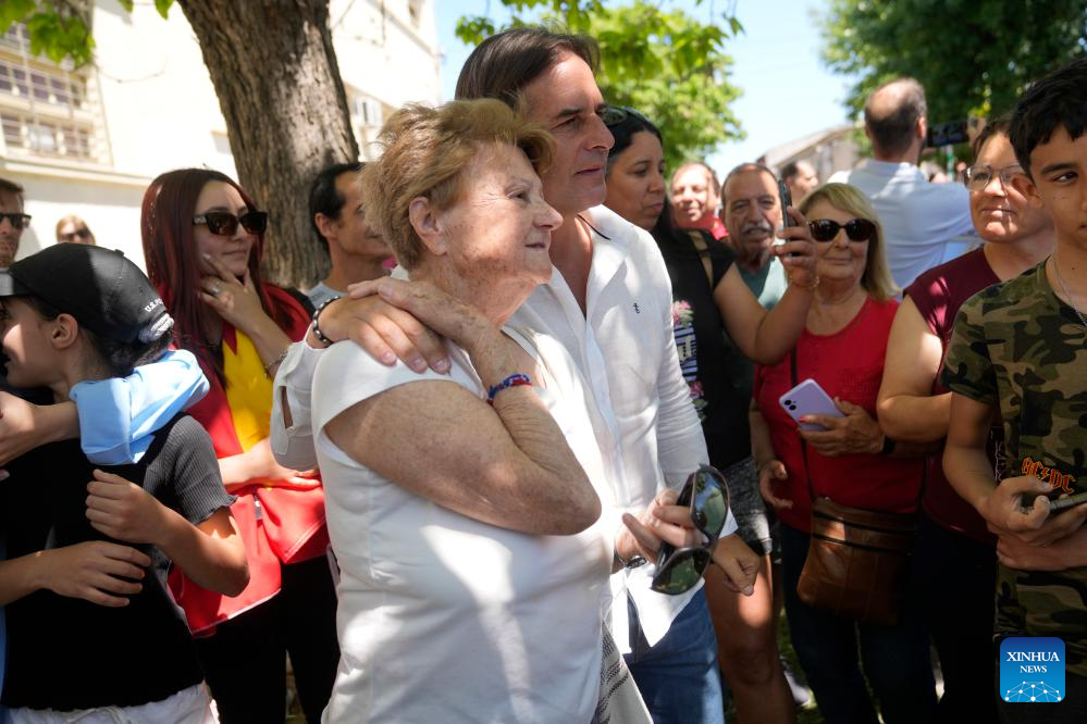 El presidente uruguayo, Luis Lacalle Pou (c), saluda a sus seguidores previo a emitir su voto durante la segunda vuelta de la elección presidencial en un colegio electoral, en Canelones, Uruguay, el 24 de noviembre de 2024. Lacalle Pou votó el domingo en la segunda vuelta de las elecciones presidenciales y dijo que esta misma noche llamará a quien resulte el candidato ganador entre el oficialista Alvaro Delgado y el opositor Yamandú Orsi para que se abra el proceso de transición de mandato. (Xinhua/Nicolás Celaya)