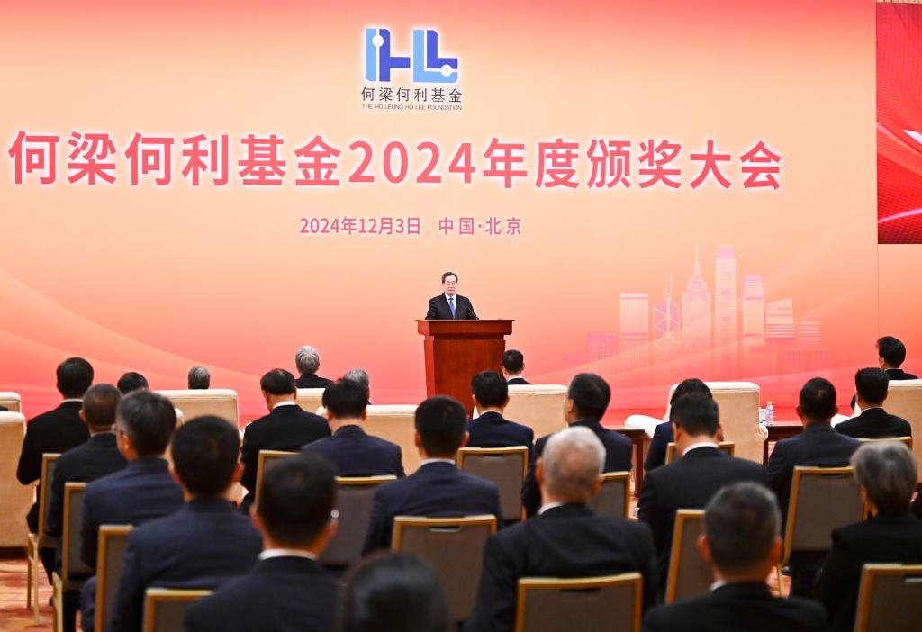 BEIJING, 3 diciembre, 2024 (Xinhua) -- El vice primer ministro chino, Ding Xuexiang, también miembro del Comité Permanente del Buró Político del Comité Central del Partido Comunista de China, se dirige a una ceremonia de premiación celebrada por la Fundación Ho Leung Ho Lee, con sede en Hong Kong, en Beijing, capital de China, el 3 de diciembre de 2024. (Xinhua/Yan Yan)