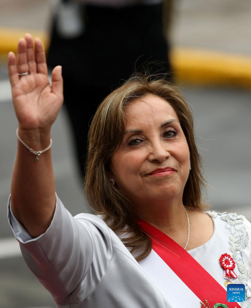 Imagen del 28 de julio de 2024 de la presidenta peruana, Dina Boluarte, saludando a la prensa durante su llegada al edificio del Congreso para dar su mensaje a la Nación con motivo de la celebración de las Fiestas Patrias, en Lima, Perú. La Fiscalía de la Nación de Perú inició el jueves una investigación contra la presidenta del país, Dina Boluarte, por haber incurrido en el presunto delito de "abandono" temporal del cargo al momento de someterse a un procedimiento quirúrgico del que no habría informado al Consejo de Ministros ni al Congreso. (Xinhua/Mariana Bazo)