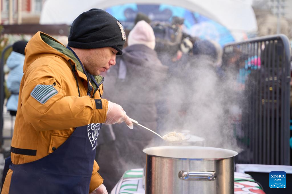 VLADIVOSTOK, 5 enero, 2025 (Xinhua) -- Un chef de un restaurante chino prepara dumplings, también conocidos como jiaozi, para las personas durante un evento del día del dumpling, en Vladivostok, Rusia, el 5 de enero de 2025. (Xinhua/Guo Feizhou)