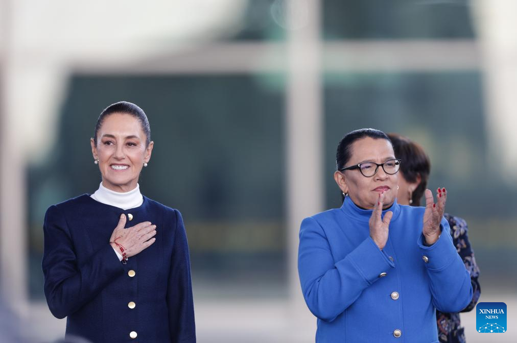 CIUDAD DE MEXICO, 13 enero, 2025 (Xinhua) -- La presidenta mexicana, Claudia Sheinbaum (i), y la secretaria de Gobernación, Rosa Icela Rodríguez (d), asisten a la presentación del Plan México, en el Museo Nacional de Antropología, en la Ciudad de México, capital de México, el 13 de enero de 2025. (Xinhua/Francisco Cañedo)