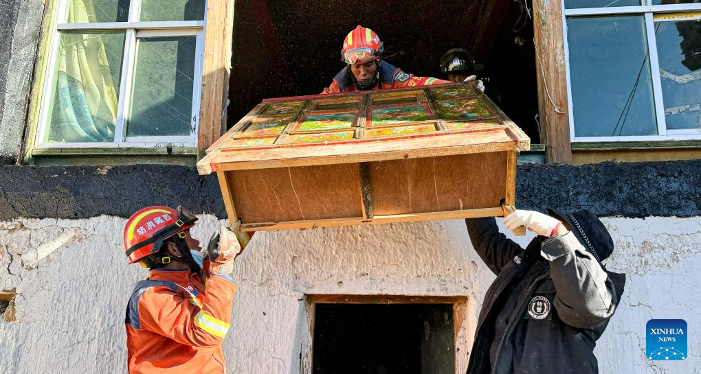 DINGRI, 16 enero, 2025 (Xinhua) -- Imagen del 15 de enero de 2025 de rescatistas ayudando a residentes a mover un mueble, en el poblado de Qulho, en el distrito de Dingri, en Xigaze, en la región autónoma de Xizang, en el suroeste de China. El trabajo de socorro en casos de desastre en el distrito de Dingri, afectado por el terremoto, incluyendo la construcción de viviendas improvisadas, el transporte de suministros y el trabajo de retiro de escombros se han acelerado para satisfacer mejor las necesidades y mejorar las condiciones de vida de los residentes. (Xinhua/Benba Toinzhub)