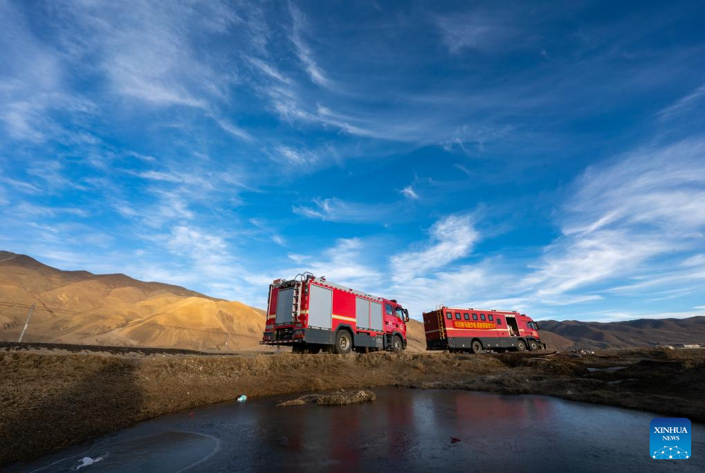 DINGRI, 16 enero, 2025 (Xinhua) -- Imagen del 15 de enero de 2025 de un camión de regaderas (d) enviado por el cuerpo de bomberos de Xizang que permitirá a los residentes tomar duchas calientes visto en el poblado de Chamco, en el distrito de Dingri, en Xigaze, en la región autónoma de Xizang, en el suroeste de China. El trabajo de socorro en casos de desastre en el distrito de Dingri, afectado por el terremoto, incluyendo la construcción de viviendas improvisadas, el transporte de suministros y el trabajo de retiro de escombros se han acelerado para satisfacer mejor las necesidades y mejorar las condiciones de vida de los residentes. (Xinhua/Tenzin Nyida)