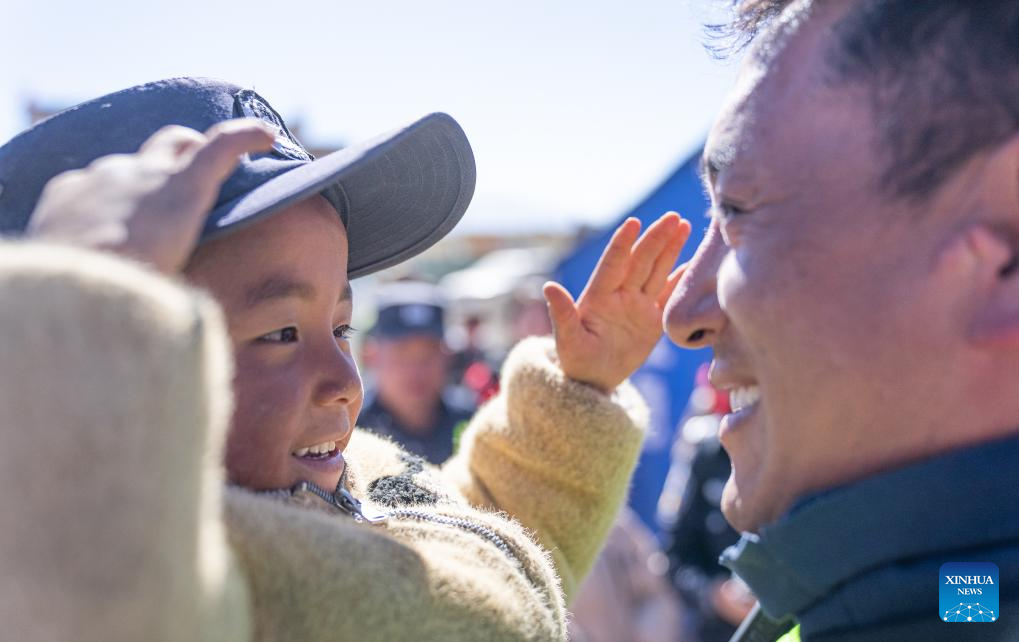 DINGRI, 16 enero, 2025 (Xinhua) -- Imagen del 14 de enero de 2025 de un niño portando una gorra de policía mientras saluda, en la aldea de Gabo, en el poblado de Chamco, en el distrito de Dingri, en Xigaze, en la región autónoma de Xizang, en el suroeste de China. El trabajo de socorro en casos de desastre en el distrito de Dingri, afectado por el terremoto, incluyendo la construcción de viviendas improvisadas, el transporte de suministros y el trabajo de retiro de escombros se han acelerado para satisfacer mejor las necesidades y mejorar las condiciones de vida de los residentes. (Xinhua/Tenzin Nyida)