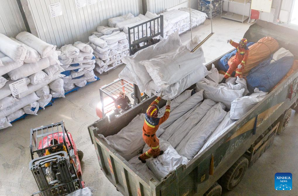 DINGRI, 16 enero, 2025 (Xinhua) -- Vista aérea tomada con un dron el 15 de enero de 2025 de miembros de un equipo de apoyo de socorro en casos de desastre cargando suministros en un vehículo en una bodega, en el distrito de Dingri, en Xigaze, en la región autónoma de Xizang, en el suroeste de China. El trabajo de socorro en casos de desastre en el distrito de Dingri, afectado por el terremoto, incluyendo la construcción de viviendas improvisadas, el transporte de suministros y el trabajo de retiro de escombros se han acelerado para satisfacer mejor las necesidades y mejorar las condiciones de vida de los residentes. (Xinhua/Tenzin Nyida)