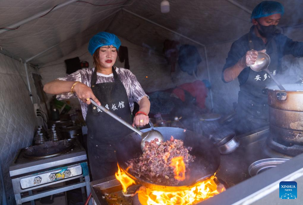 DINGRI, 16 enero, 2025 (Xinhua) -- Imagen del 15 de enero de 2025 de cocineros de un restaurante elaborando almuerzos para residentes en un sitio de reasentamiento, en el poblado de Chamco, en el distrito de Dingri, en Xigaze, en la región autónoma de Xizang, en el suroeste de China. El trabajo de socorro en casos de desastre en el distrito de Dingri, afectado por el terremoto, incluyendo la construcción de viviendas improvisadas, el transporte de suministros y el trabajo de retiro de escombros se han acelerado para satisfacer mejor las necesidades y mejorar las condiciones de vida de los residentes. (Xinhua/Tenzin Nyida)