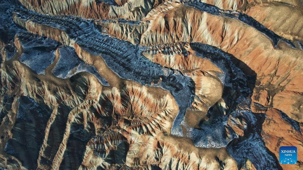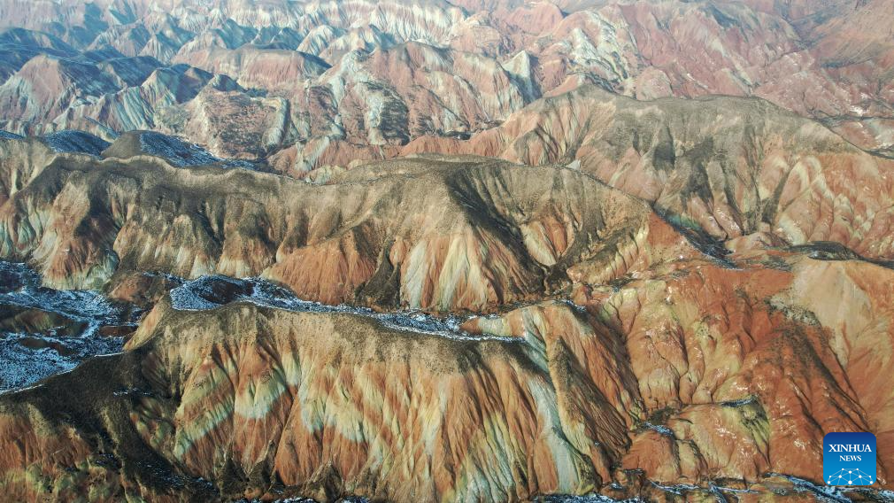 LANZHOU, 17 enero, 2025 (Xinhua) -- Vista aérea tomada con un dron el 17 de enero de 2025 del relieve de Danxia, caracterizado por elementos de arenisca rojiza, en el área escénica Danxia de Shuimo, en Lanzhou, en la provincia de Gansu, en el noroeste de China. (Xinhua/Chen Bin)