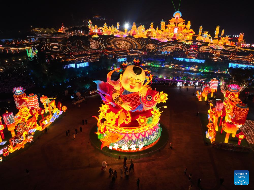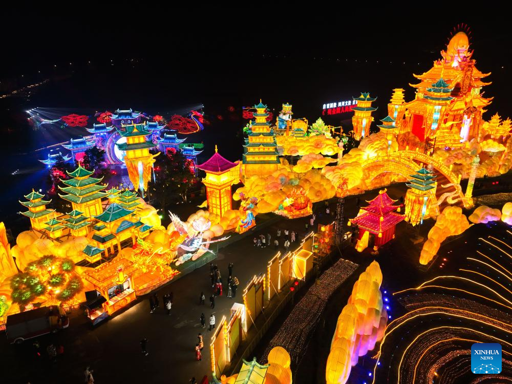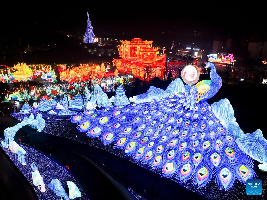 ZIGONG, 17 enero, 2025 (Xinhua) -- Vista aérea tomada con un dron el 17 de enero de 2025 del 31 Espectáculo Internacional de Linternas de Dinosaurio de Zigong, en Zigong, en la provincia de Sichuan, en el suroeste de China. El 31 Espectáculo Internacional de Linternas de Dinosaurio de Zigong, comenzó aquí el viernes. El espectáculo de linternas de este año está organizado con doce grupos de juegos de luces súper grandes, siete grupos de juegos de luces grandes y más de 200 grupos de juegos de luces pequeños y medianos. La escala de las exhibiciones de linternas ha establecido un nuevo récord en la historia del Espectáculo Internacional de Linternas de Dinosaurios de Zigong. (Xinhua/Wang Xi)
