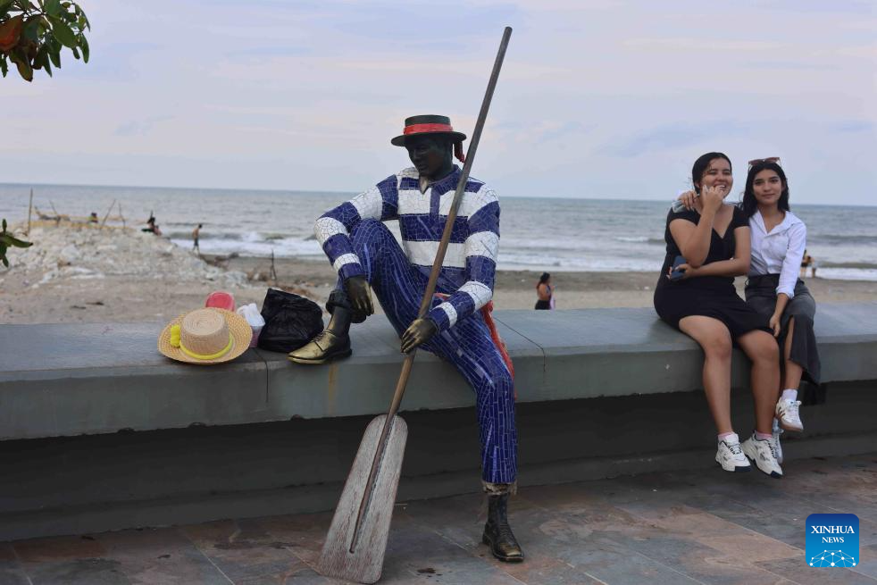 PUERTO COLOMBIA, 17 enero, 2025 (Xinhua) -- Imagen del 3 de enero de 2025 de turistas sentándose junto a una estatua de un marinero, en Puerto Colombia, Colombia. La construcción de Puerto Colombia comenzó en 1888 y el muelle de la ciudad se puso en funcionamiento en 1893. Puerto Colombia sufrió un declive gradual con el desarrollo del cercano puerto de Barranquilla, y su muelle fue oficialmente desmantelado en 1943. En la última década el gobierno colombiano ha renovado partes del erosionado muelle de la ciudad. La ciudad adquirió así una renovada vitalidad a medida que se exploraban más a fondo sus valores históricos, culturales y turísticos. (Xinhua/Zhou Shengping)