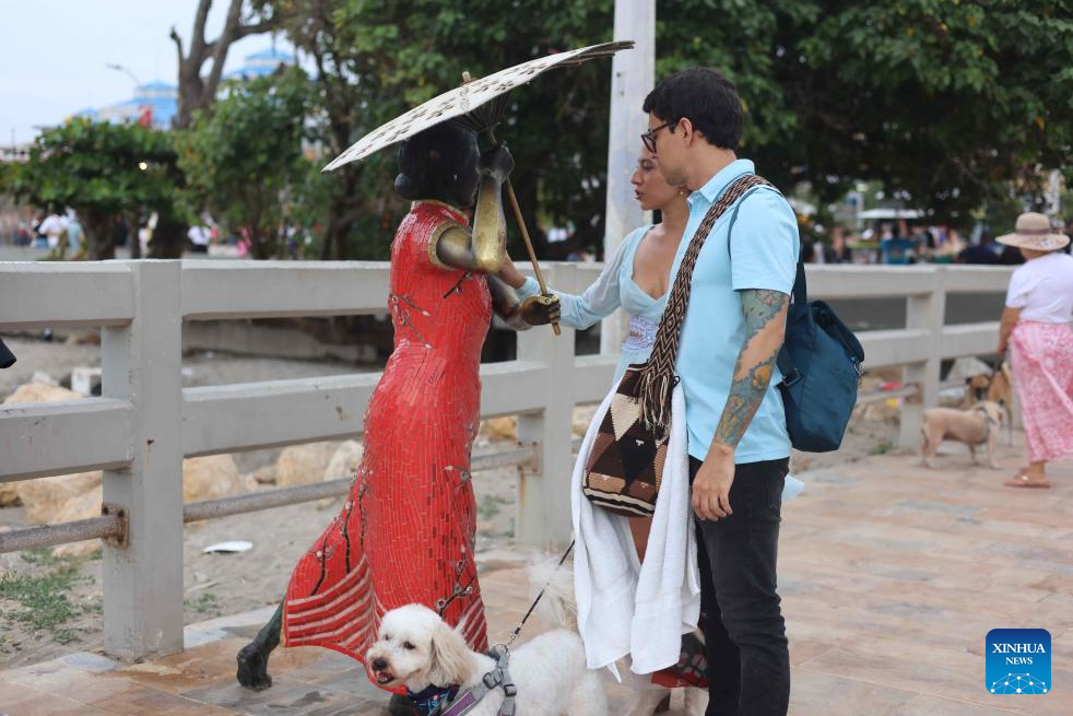 PUERTO COLOMBIA, 17 enero, 2025 (Xinhua) -- Imagen del 3 de enero de 2025 de turistas observando la estatua de una mujer china, en Puerto Colombia, Colombia. La construcción de Puerto Colombia comenzó en 1888 y el muelle de la ciudad se puso en funcionamiento en 1893. Puerto Colombia sufrió un declive gradual con el desarrollo del cercano puerto de Barranquilla, y su muelle fue oficialmente desmantelado en 1943. En la última década el gobierno colombiano ha renovado partes del erosionado muelle de la ciudad. La ciudad adquirió así una renovada vitalidad a medida que se exploraban más a fondo sus valores históricos, culturales y turísticos. (Xinhua/Zhou Shengping)