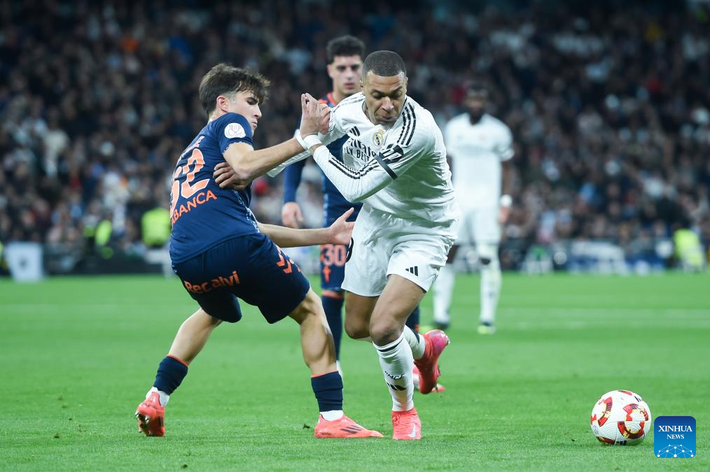 MADRID, 17 enero, 2025 (Xinhua) -- Imagen del 16 de enero de 2025 de Kylian Mbappé (d), de Real Madrid, disputando el balón con Javi Rodríguez, de RC Celta, durante el partido de fútbol de la Copa del Rey entre Real Madrid y RC Celta, en Madrid, España. (Xinhua/Gustavo Valiente)