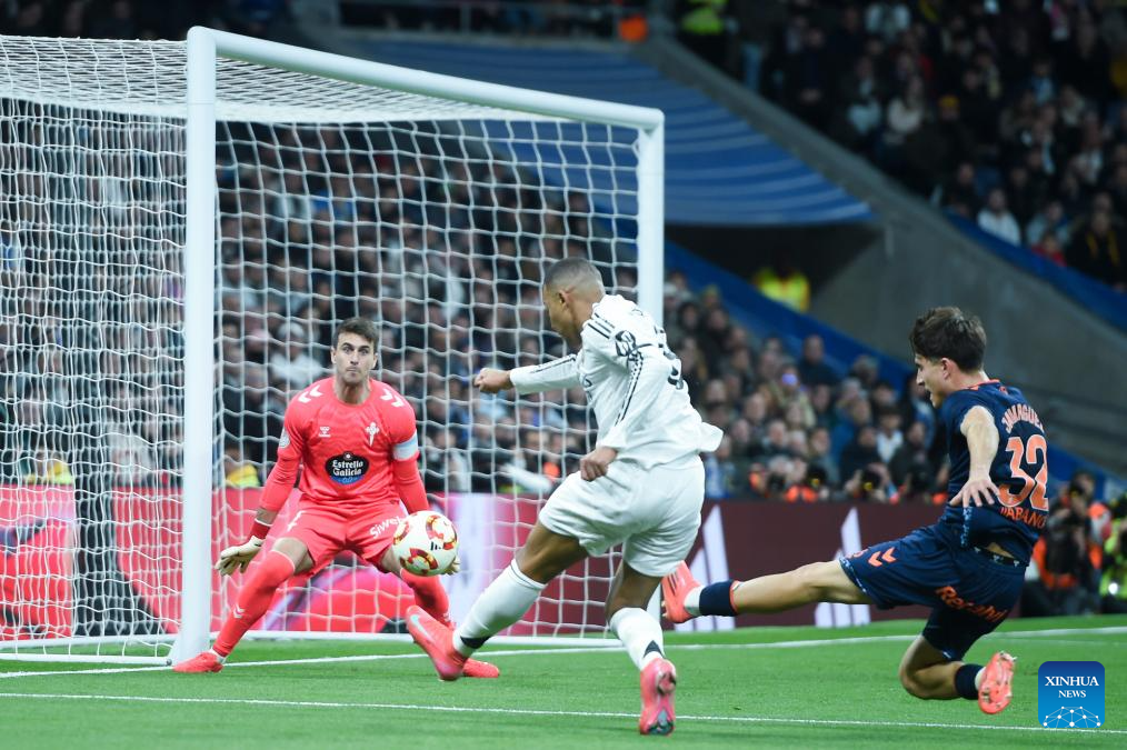 MADRID, 17 enero, 2025 (Xinhua) -- Imagen del 16 de enero de 2025 de Kylian Mbappé (c), de Real Madrid, realizando una anotación durante el partido de fútbol de la Copa del Rey entre Real Madrid y RC Celta, en Madrid, España. (Xinhua/Gustavo Valiente)