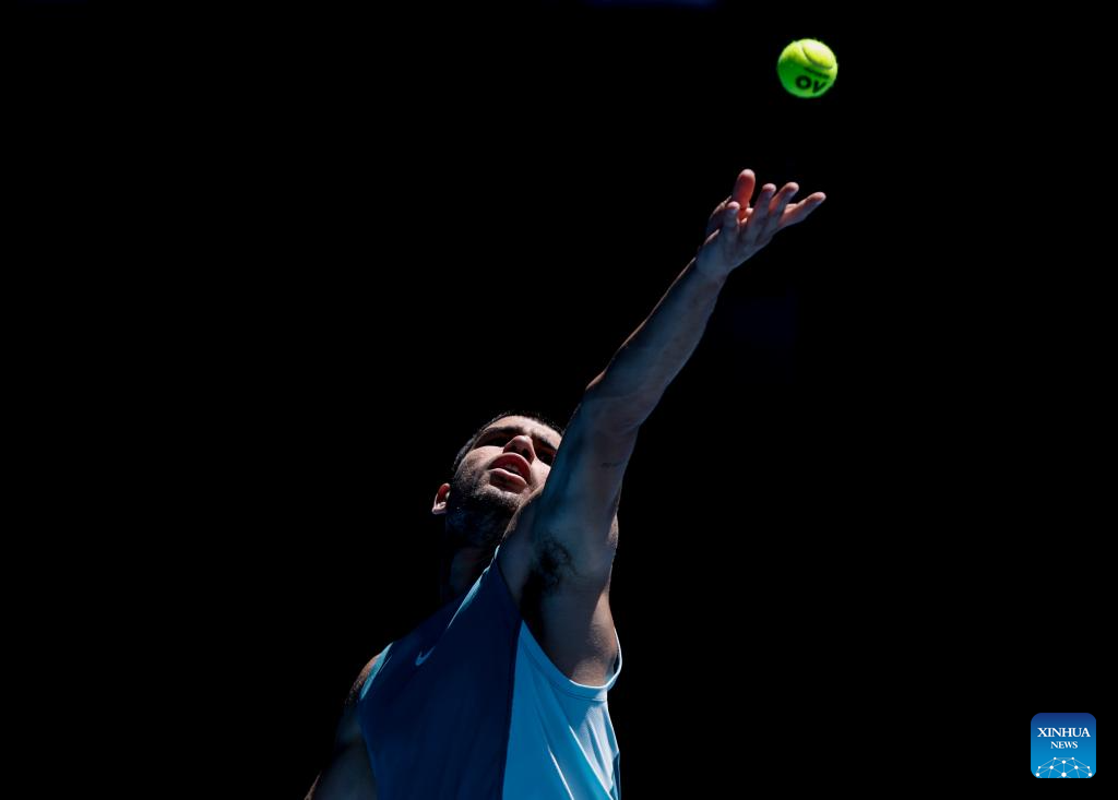 MELBOURNE, 17 enero, 2025 (Xinhua) -- Carlos Alcaraz sirve la pelota durante el partido de tercera ronda de individuales masculinos entre Carlos Alcaraz, de España, y Nuno Borges, de Portugal, en el torneo de tenis Abierto de Australia, en Melbourne, Australia, el 17 de enero de 2025. (Xinhua/Ma Ping)