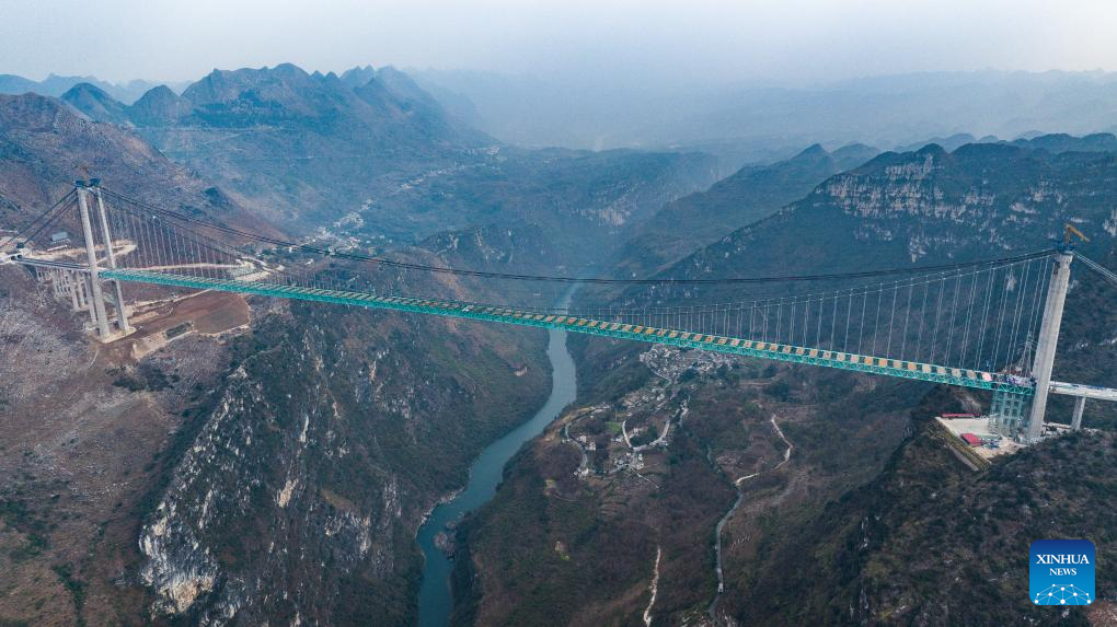 ZHENFENG, 17 enero, 2025 (Xinhua) -- Vista aérea tomada con un dron el 17 de enero de 2025 del Puente del Gran Cañón de Huajiang, en la provincia de Guizhou, en el suroeste de China. China terminó el viernes la construcción de la estructura principal del Puente del Gran Cañón de Huajiang en la provincia suroccidental de Guizhou, el cual una vez terminado será el más alto del mundo. El proyecto está a cargo de Guizhou Transportation Investment Group Co., Ltd. y se trata de un puente colgante con una altura vertical de 625 metros desde la plataforma hasta la superficie del río. El puente de 2.890 metros de largo, con una arcada de 1.420 metros, es también el de mayor arcada del mundo construido en una zona montañosa. (Xinhua/Tao Liang)