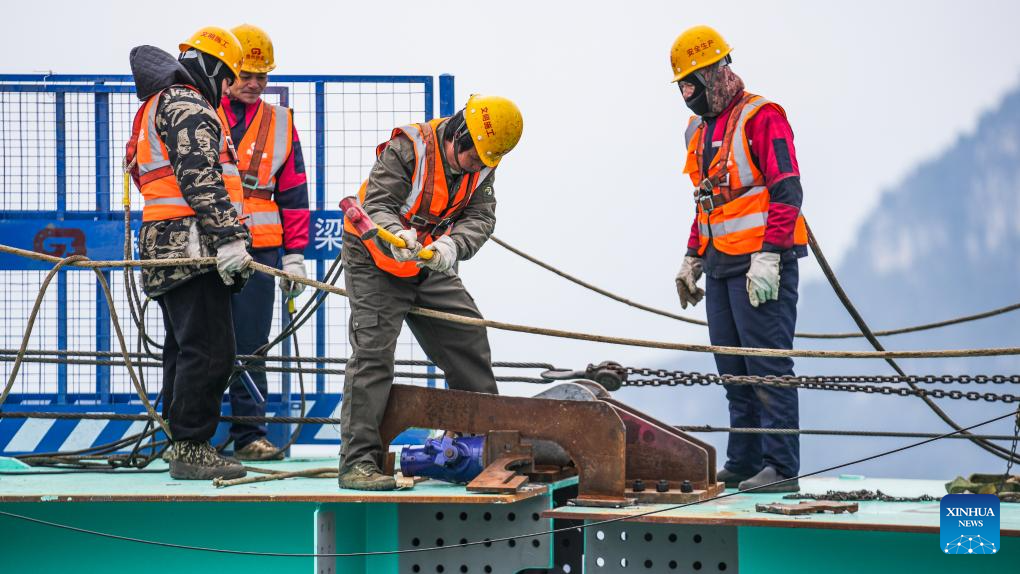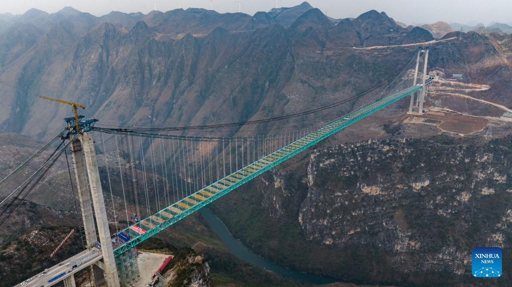 ZHENFENG, 17 enero, 2025 (Xinhua) -- Trabajadores laboran en el sitio de construcción del Puente del Gran Cañón de Huajiang, en la provincia de Guizhou, en el suroeste de China, el 17 de enero de 2025. China terminó el viernes la construcción de la estructura principal del Puente del Gran Cañón de Huajiang en la provincia suroccidental de Guizhou, el cual una vez terminado será el más alto del mundo. El proyecto está a cargo de Guizhou Transportation Investment Group Co., Ltd. y se trata de un puente colgante con una altura vertical de 625 metros desde la plataforma hasta la superficie del río. El puente de 2.890 metros de largo, con una arcada de 1.420 metros, es también el de mayor arcada del mundo construido en una zona montañosa. (Xinhua/Tao Liang)