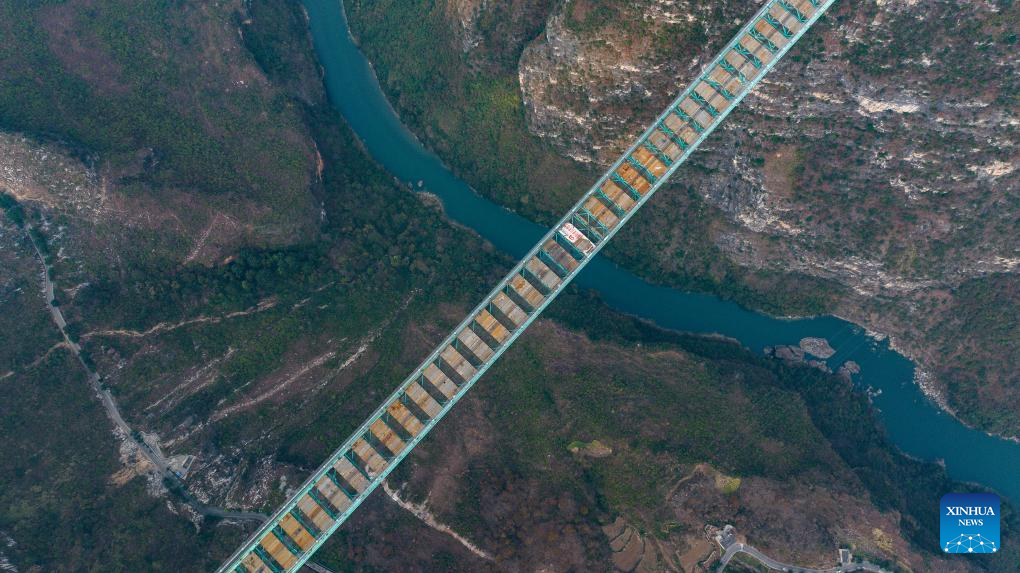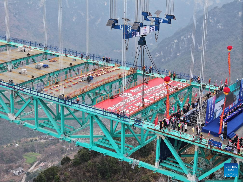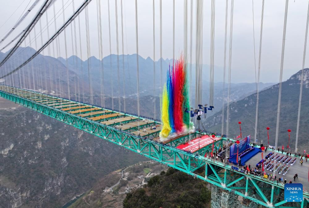 ZHENFENG, 17 enero, 2025 (Xinhua) -- Vista aérea tomada con un dron el 17 de enero de 2025 de una ceremonia que marca la finalización de la estructura principal del Puente del Gran Cañón de Huajiang, en la provincia de Guizhou, en el suroeste de China. China terminó el viernes la construcción de la estructura principal del Puente del Gran Cañón de Huajiang en la provincia suroccidental de Guizhou, el cual una vez terminado será el más alto del mundo. El proyecto está a cargo de Guizhou Transportation Investment Group Co., Ltd. y se trata de un puente colgante con una altura vertical de 625 metros desde la plataforma hasta la superficie del río. El puente de 2.890 metros de largo, con una arcada de 1.420 metros, es también el de mayor arcada del mundo construido en una zona montañosa. (Xinhua/Liu Xu)